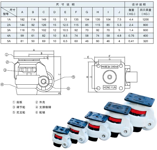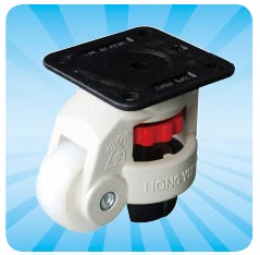 可移动脚轮由底板、支架、调节轮、支撑垫、 轮子、固定螺栓等组成。可移动脚轮共有5种规格,主要用于环境可移动仪器设备底部的支撑。